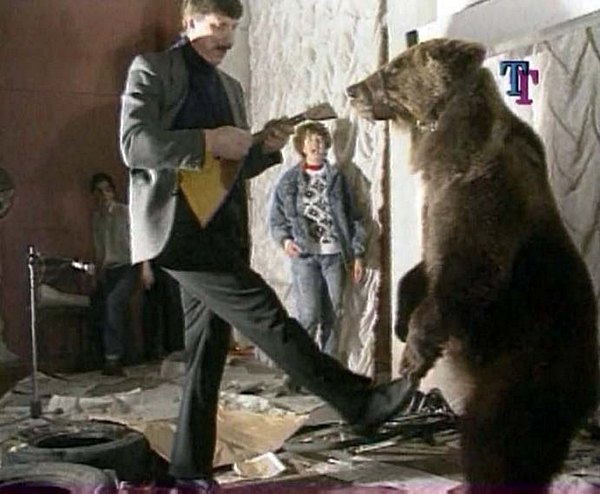 Further, a brown bear (in the film was white) ran onto the stage with the trainer, who had a balalaika. He was trying to make the bear dance. As there was an atmosphere of total anarchy, the bear did not obey. The bear was attracted by common fun and he ran into the hall and began to wander in the aisles, and people pulled his hair and ears.